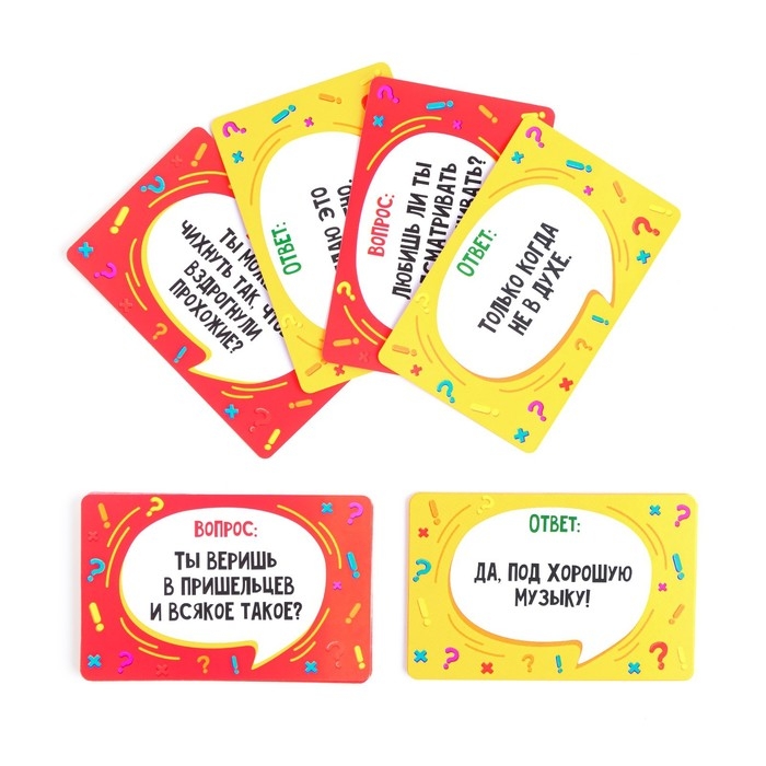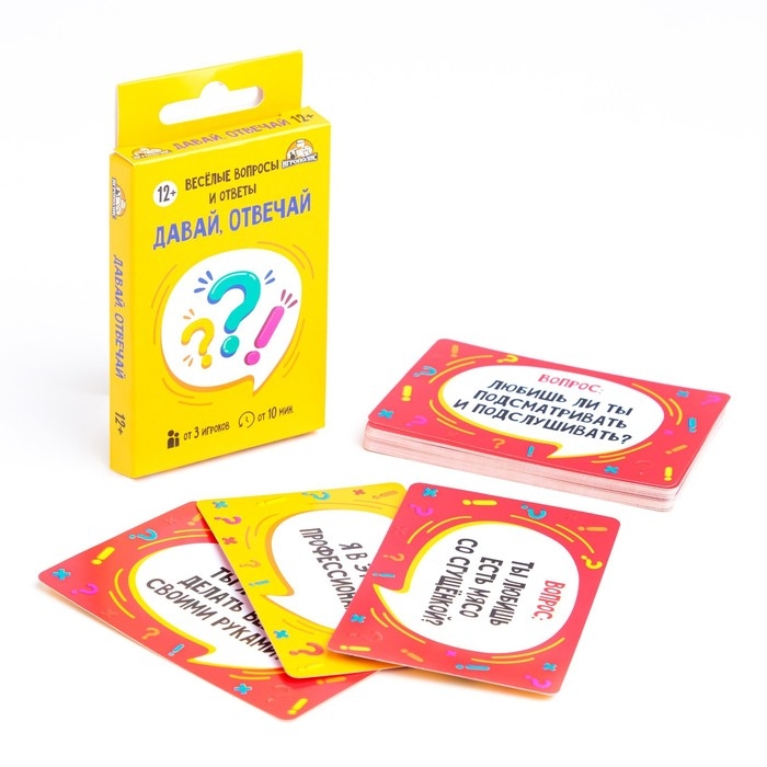 Отличная игра для весёлой компании, в которой необходимо вытягивать вопросы и ответы из предложенных карточек. Получиться могут самые неожиданные комбинации. Материал: картон. Количество игроков: 3+. Возраст: 12+