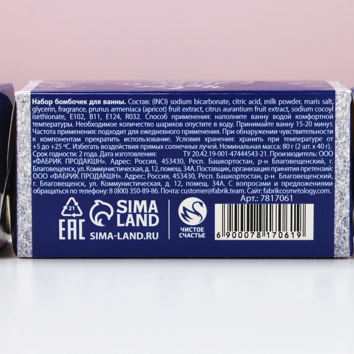 Состав: бикарбонат натрия, соль морская, кислота лимонная, парфюмерная композиция, пищевой краситель.