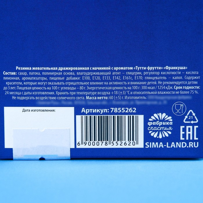 Состав: сахар, патока, полимерная основа, влагоудерживающий агент – глиценрин, регулятор кислотности – кислота лимонная, ароматизаторы, пищевые добавки: Е100, Е120, Е133, Е142, Е161с, Е170; глянцеватель – капол.