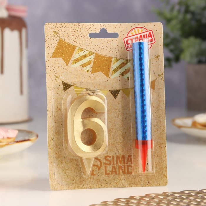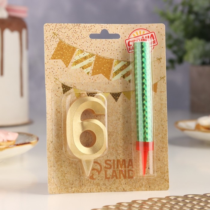 Свеча для торта цифра "Грань + фонтан" золотая "6"