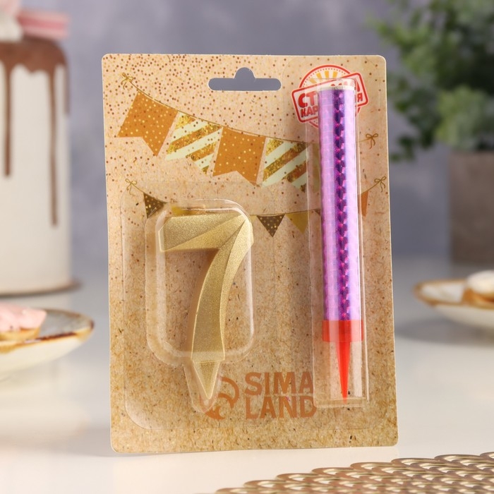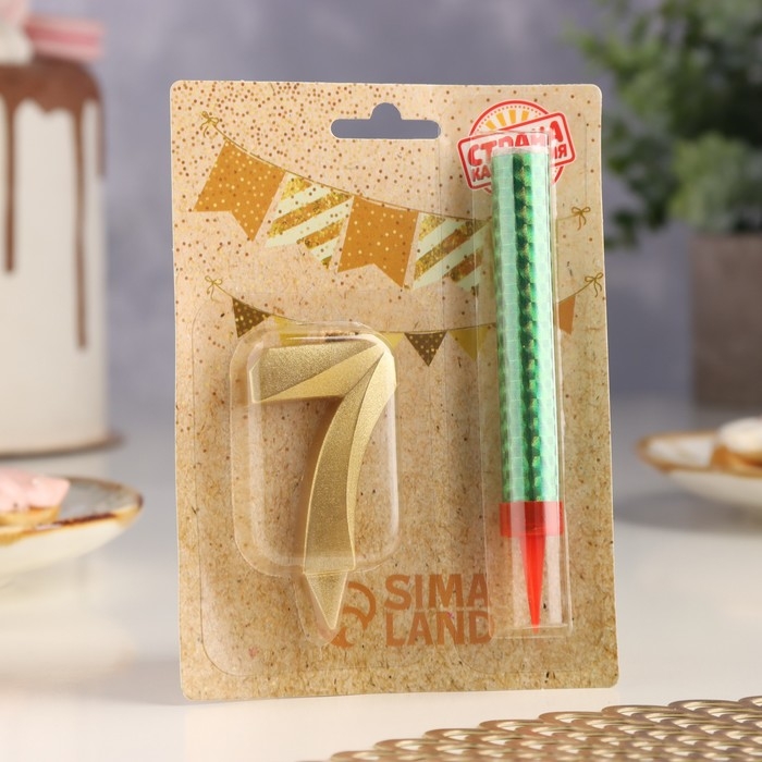 Свеча для торта цифра "Грань + фонтан" золотая "7"