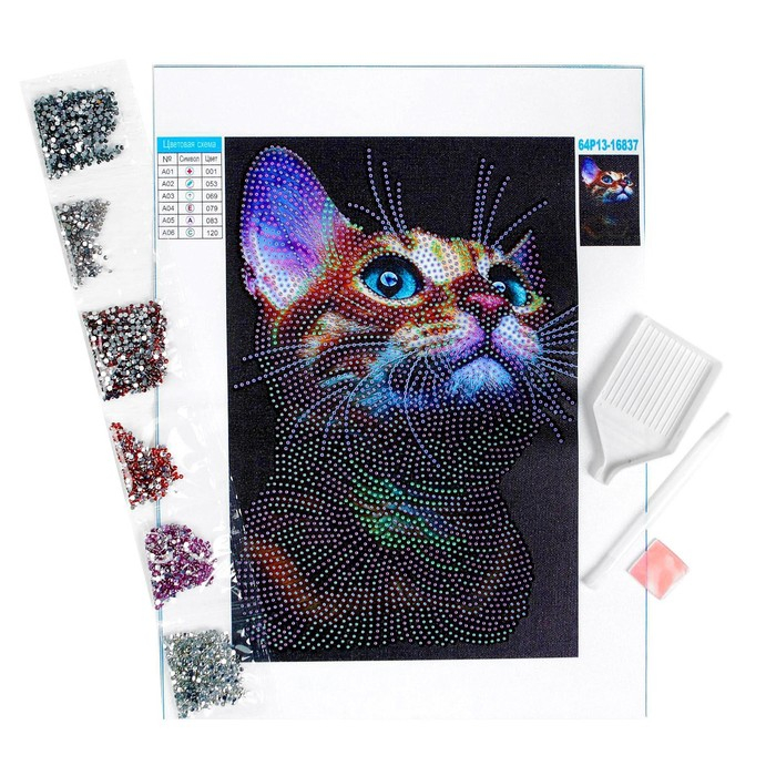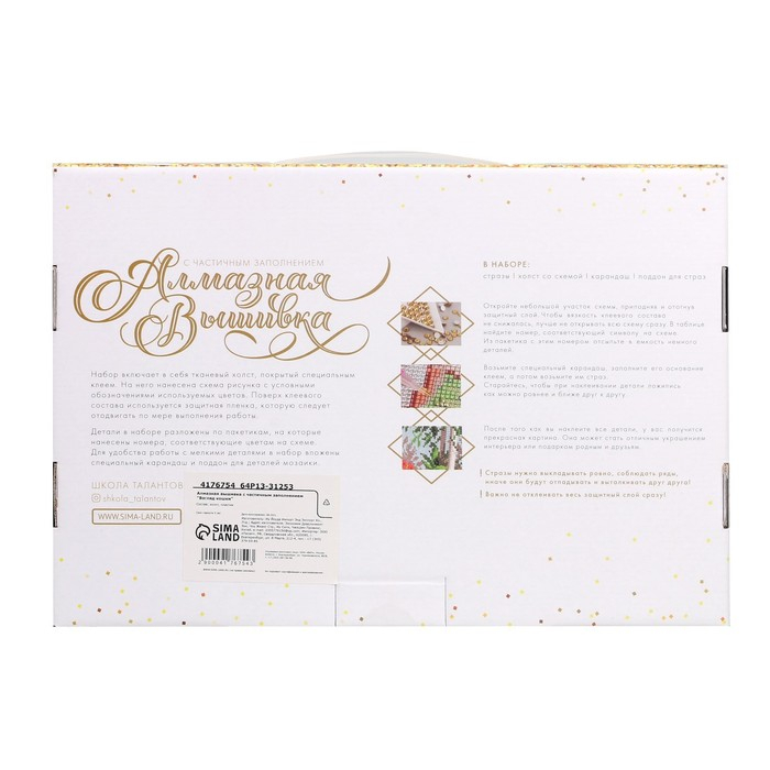 Часть изображения предстоит заполнить стразами, другая часть напечатана на холсте-основе. Поэтому набор подойдёт для тех, кто впервые пробует свои силы в этой технике или любит быстро добиваться результата.