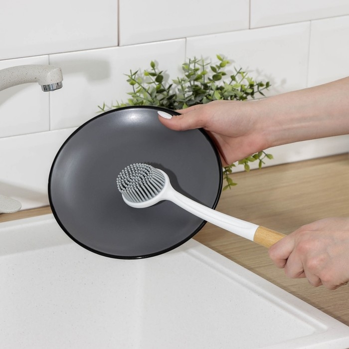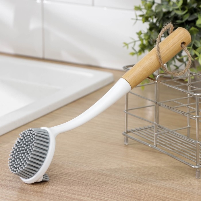 Щётка для посуды Доляна Meli — идеальный помощник для мам и домохозяек! Двухсторонняя бамбуковая ручка обеспечивает удобство использования, а мягкий ворс TPR размером 1,8 см позволяет бережно очищать кастрюли, сковороды, противни и гриль. Благодаря отверстию для подвешивания щётка занимает минимум места на кухне. Купите сейчас и наслаждайтесь чистотой без лишних усилий!