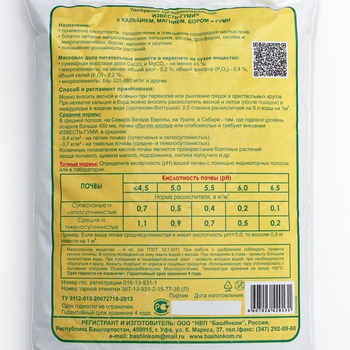 Необходим для внесения в кислые почвы. При этом резко улучшается поступление питательных веществ в растения, тяжелые суглинистые и глинистые почвы после известкования становятся рыхлыми, воздушными, избыточная влага не застаивается, улучшается тургор растений и сохранность завязей. Внесенная в полной дозе известь действует в течение 5-7 лет, а значит окупается богатыми урожаями из года в год. Мягкий раскислитель почвы Известь - Гуми обогащен микроэлементом бором, а также кальцием, магнием, азотом, фосфором, калием, плодородным гумусом и природным витамином роста Гуми.