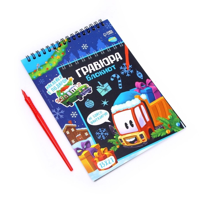 Блокнот - гравюра на новый год «Транспорт», 10 листов, лист наклеек