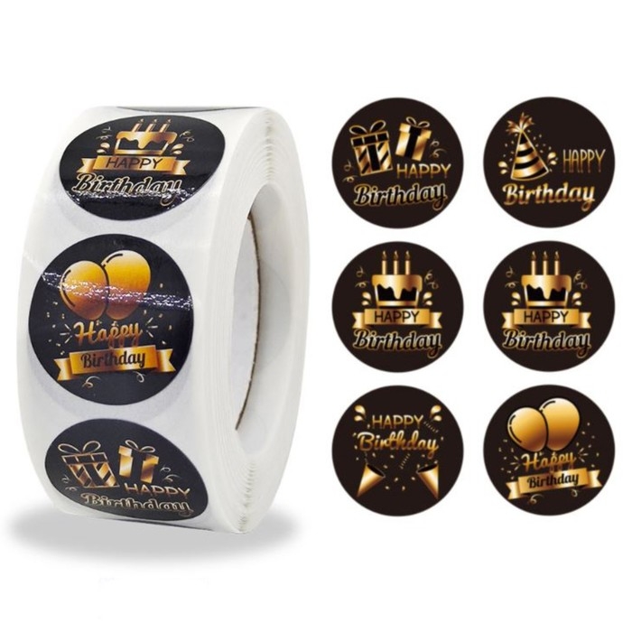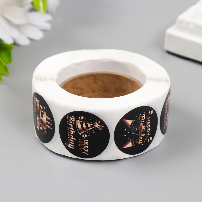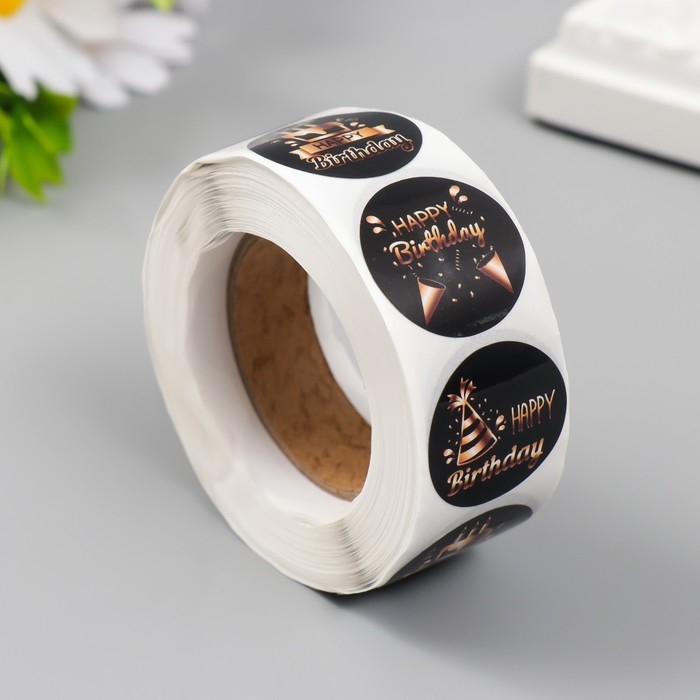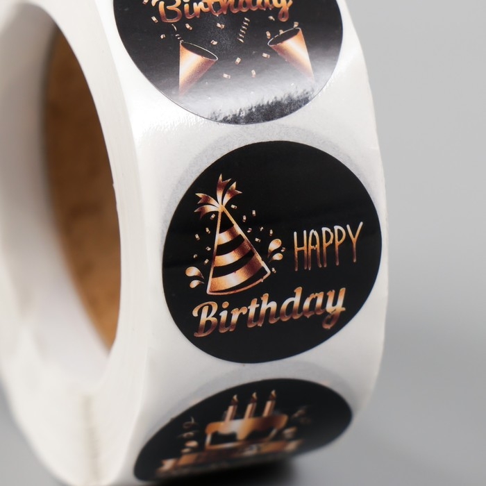 Наклейка бумага "День рождение" золото d=2,5 см 500 шт в рулоне 3х6,5х6,5 см