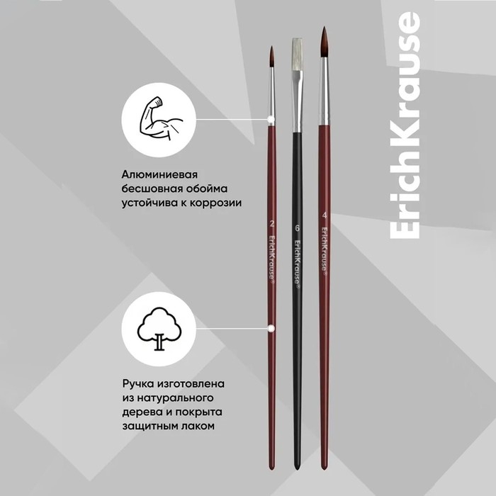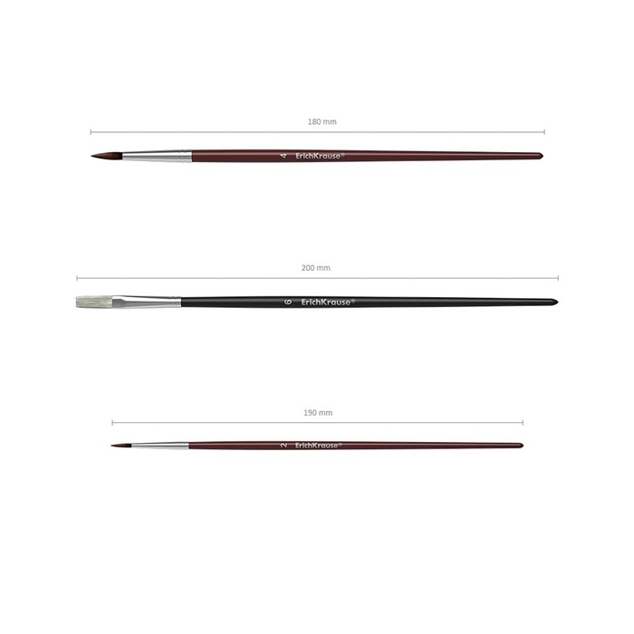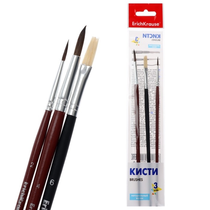 Кисти ErichKrause для рисования акварельными красками и гуашью. Хорошо впитывают и отдают краску, рабочая часть кисти покрыта гуммирующим составом, защищающим ее при хранении и транспортировке. Ручка изготовлена из натурального дерева и покрыта защитным лаком. Кисти разного размера позволяют рисовать как крупными, широкими мазками, так и прорабатывать мелкие детали рисунка. Цельнометаллическая бесшовная обойма из алюминия устойчива к коррозии. Пони круглые- 2,4; Щетина плоская- 6