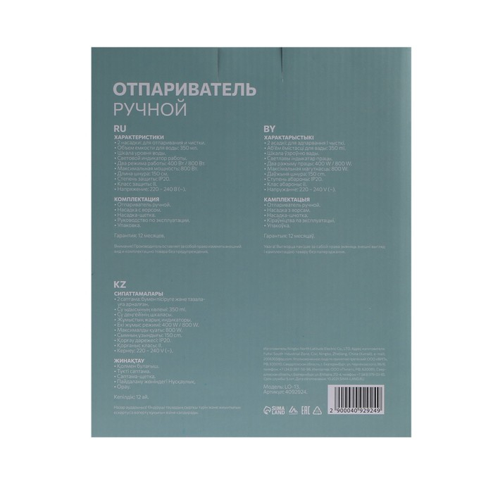 Отпариватель Luazon LO-13, ручной, 350 мл, 2 режима работы 400/800 Вт, 220 В, белый