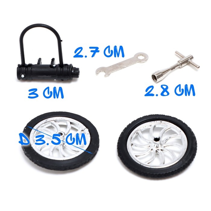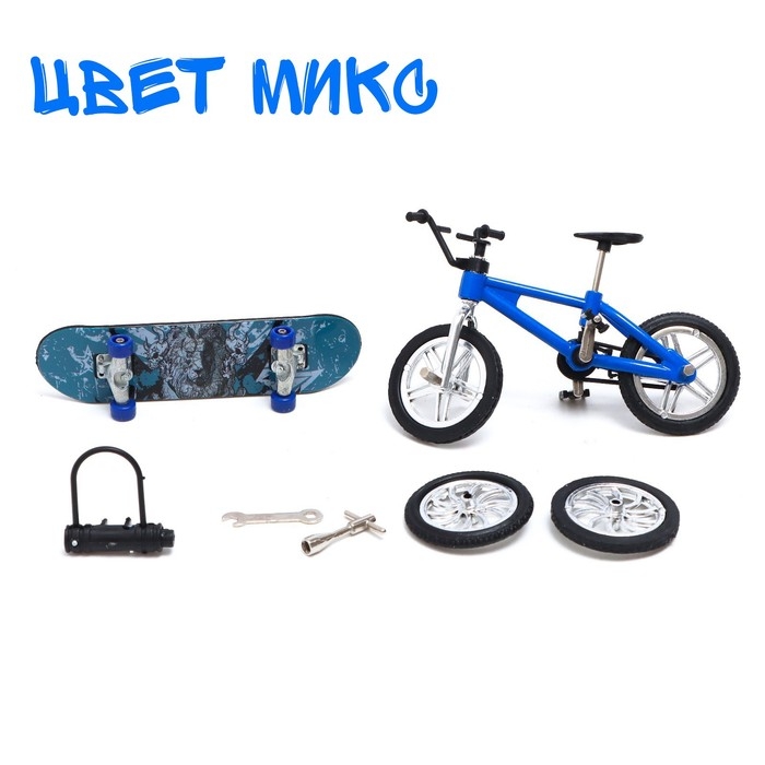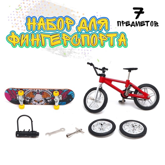 - В комплект входят фингербайк и фингерборд — уменьшенные версии велосипеда и скейтборда.