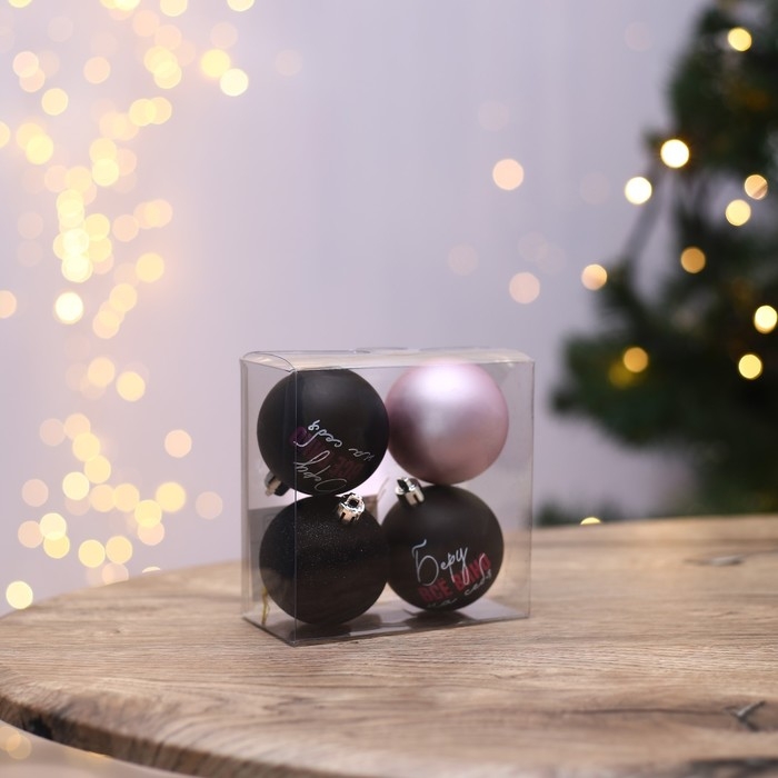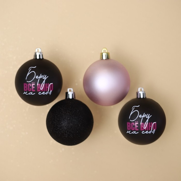 Шары ёлочные новогодние «Беру все вино на себя», на Новый год, пластик, d=6, 4 шт., цвет чёрный и нежно - розовый