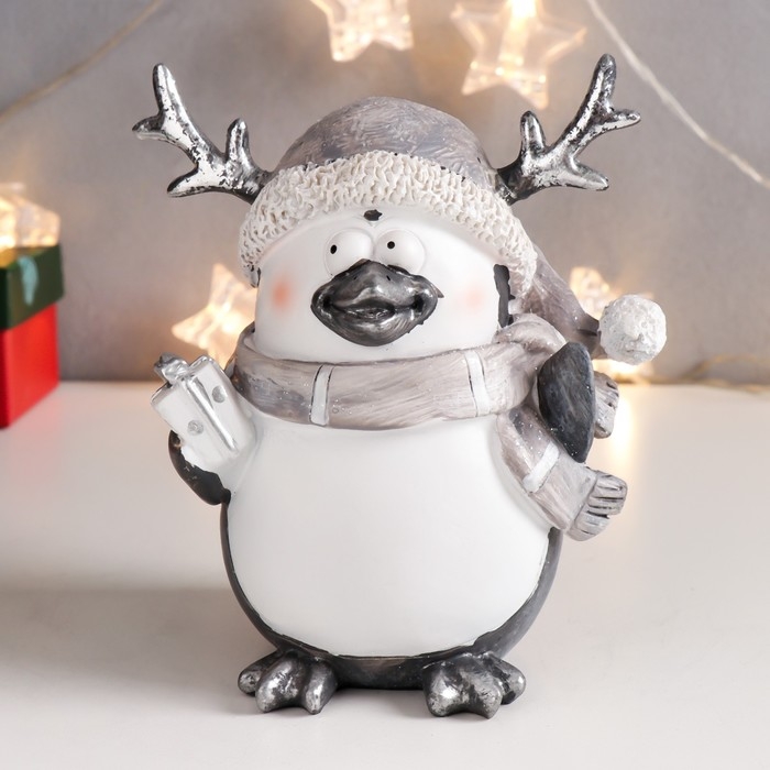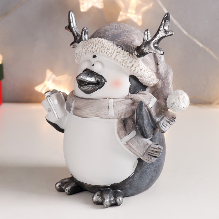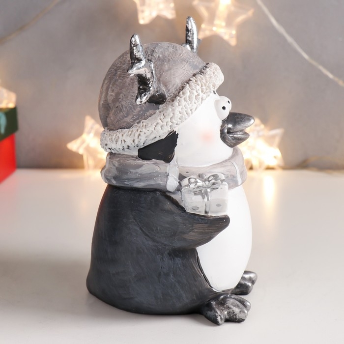 Сувенир полистоун "Пингвинчик в шарфике и колпаке с рожками, с подарком"МИКС 15,5х13х9 см