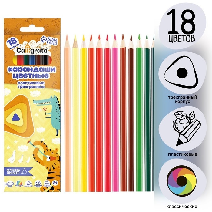 Карандаши 18 цветов Calligrata, ЭКОНОМ, заточенные, трёхгранные, пластиковые, картонная упаковка, европодвес