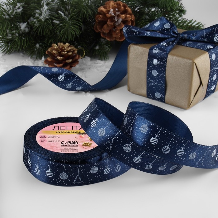 Новый год! Лента атласная «Ёлочные игрушки», 25 мм, 23 ± 1 м, цвет тёмно-синий №038