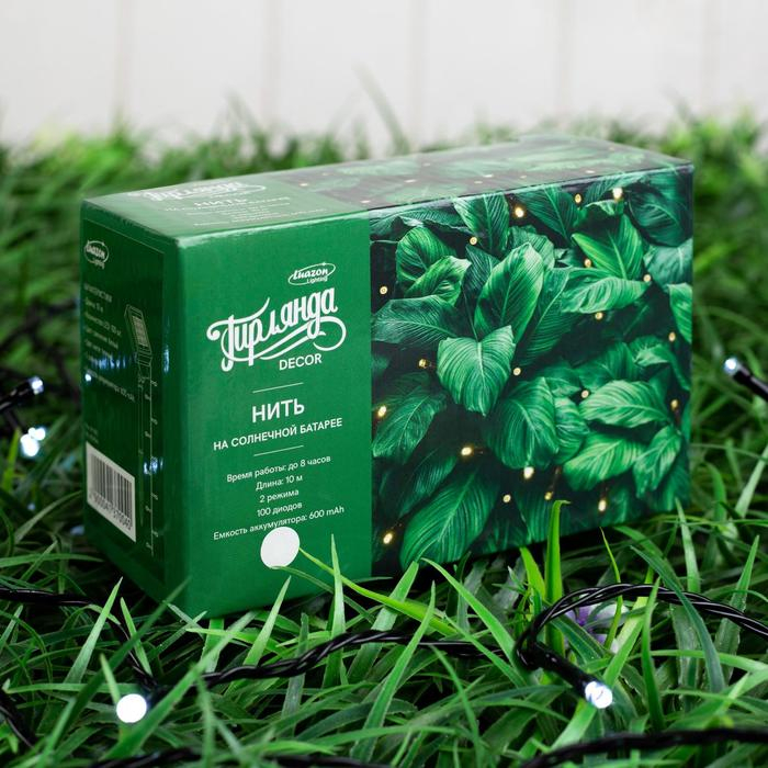 Гирлянда «Нить» 10 м, IP44, тёмная нить, 100 LED, свечение белое, 2 режима, солнечная батарея