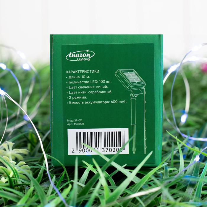 Гирлянда «Нить» 10 м роса, серебристая нить, 100 LED, свечение синее, 2 режима, солнечная батарея