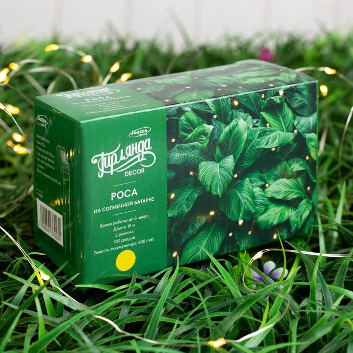 Гирлянда «Нить» 10 м роса, IP44, серебристая нить, 100 LED, свечение жёлтое, 2 режима, солнечная батарея