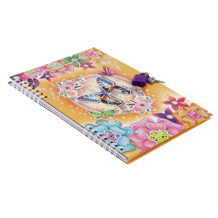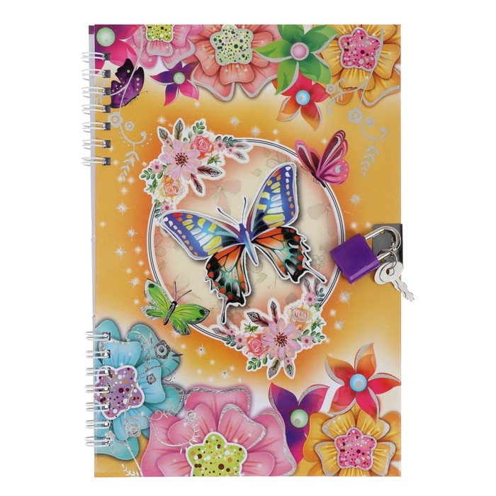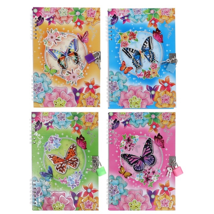 Записная книжка подарочная на замочке, А5, 50 листов, линия, "Цветочки/ Бабочки", МИКС