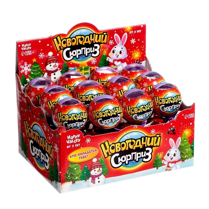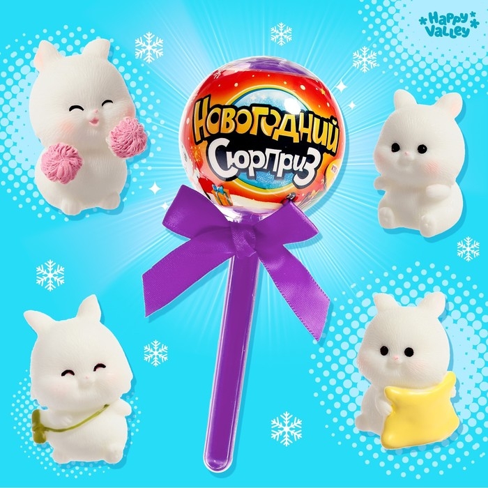 В каждом шаре на палочке спрятались маленькие зайчата. Какие достанутся вам, останется секретом, пока не откроете шар. А ещё малыши найдут внутри яркие новогодние наклейки. Соберите их всех.