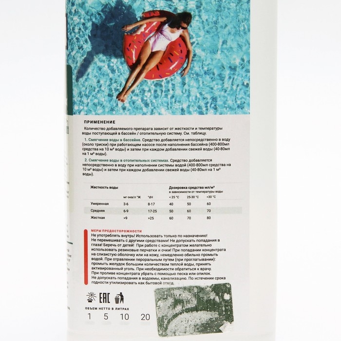 Использование средства предотвращает выпадение жестких образований в воде. Не приводит к помутнению воды и образованию известковых отложений, способен связывать металлы и не допускает окрашивания воды ионами металлов. Средство стабильно к хлору, рН – нейтрально. Не содержит фосфатов и не вносит питательных веществ для водорослей. Cодержит поликарбоновую кислоту.