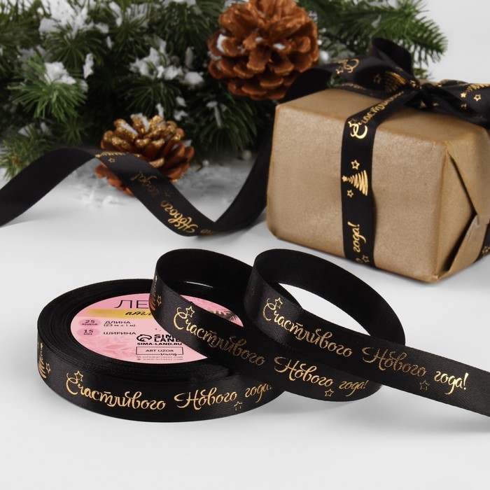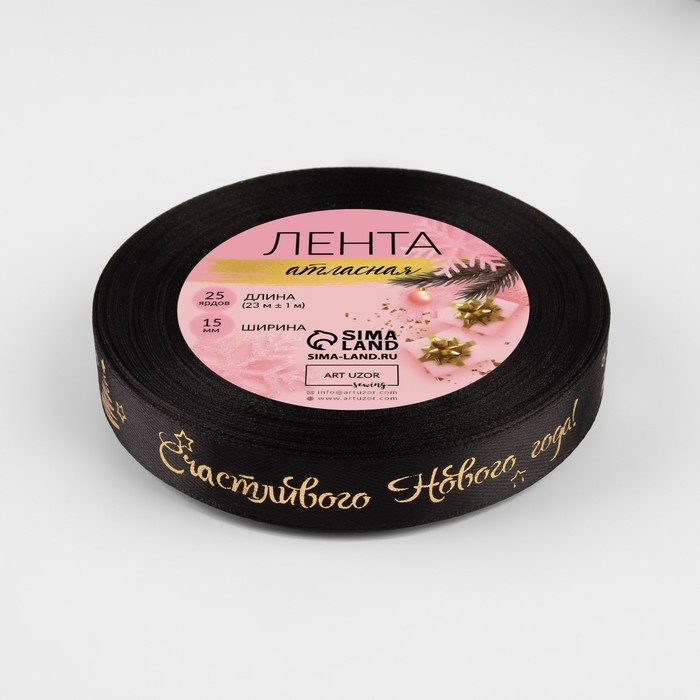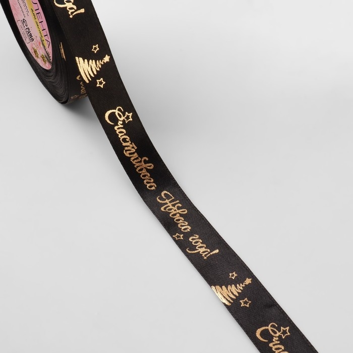 Новый год! Лента атласная с тиснением «Счастливого Нового года!», 15 мм, 23 ± 1 м, цвет чёрный/золотой №039