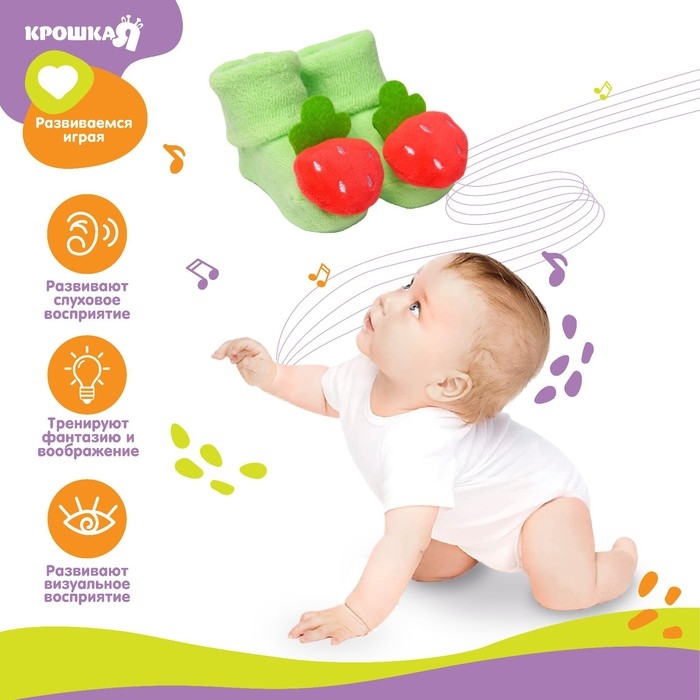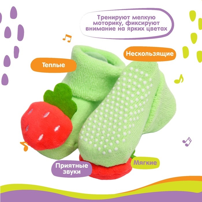 Носочки погремушки со звуковым эффектом не только согреют ножки вашего малыша, но и привлекут его внимание яркими цветами, а также звоном погремушек. Малыш сможет до них дотянуться, потрогать ручками или просто погреметь ими, подергав ножками. Малыш играет и развивает не только мышцы, но и координацию, моторику, внимание, зрение, слуховое восприятие. Милые игрушки пробуждают его стремление исследовать мир вокруг себя. Изготовлены из качественного и безопасного для здоровья детей материала, который не выцветает. Станут отличным подарком вашим близким.