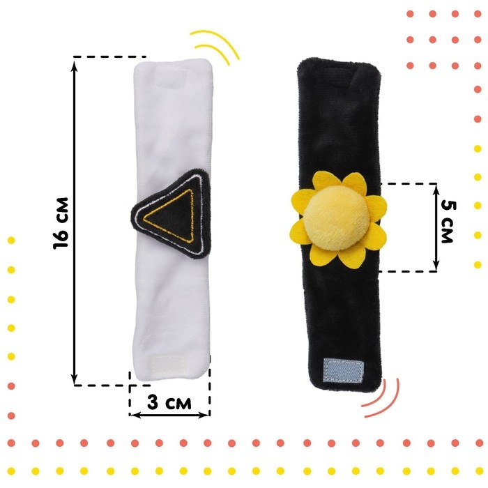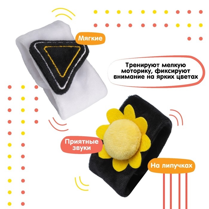 Развивающая игрушка выполнена в виде браслетика на липучке. В комплект входят две штуки. Их можно надеть малышу на ручки или ножки. Звуковые элементы будут греметь, когда непоседа сменит положение тела.