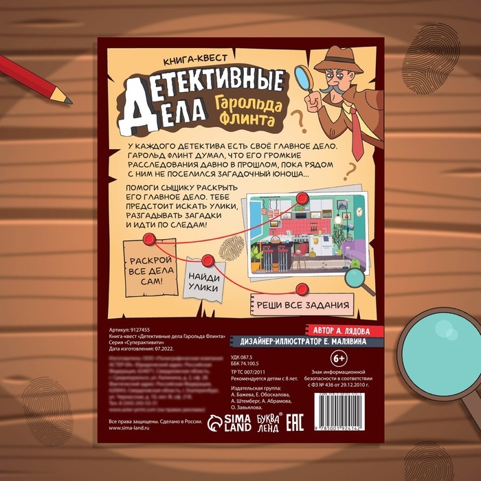 - На страницах ребёнка ждут увлекательные задания, которые помогут ему раскрыть дело вместе с сыщиком. Юному детективу предстоит разгадывать загадки, искать улики, идти по следам и не только!