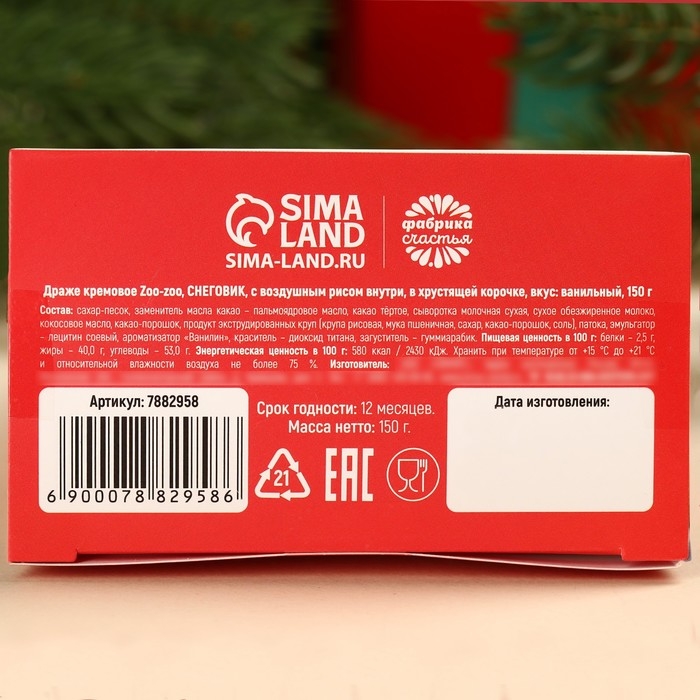 Состав: сахар-песок, заменитель масла какао – пальмоядровое масло, какао тёртое, сыворотка молочная сухая, сухое обезжиренное молоко, кокосовое масло, какао-порошок, продукт экструдированных круп (крупа рисовая, мука пшеничная, сахар, какао-порошок, соль), патока, эмульгатор – лецитин соевый, ароматизатор «Ванилин», краситель – диоксид титана, загуститель – гуммиарабик.