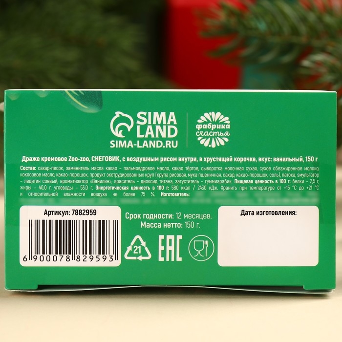 Состав: сахар-песок, заменитель масла какао – пальмоядровое масло, какао тёртое, сыворотка молочная сухая, сухое обезжиренное молоко, кокосовое масло, какао-порошок, продукт экструдированных круп (крупа рисовая, мука пшеничная, сахар, какао-порошок, соль), патока, эмульгатор – лецитин соевый, ароматизатор «Ванилин», краситель – диоксид титана, загуститель – гуммиарабик.