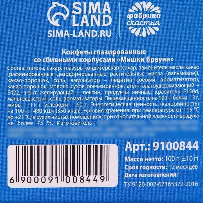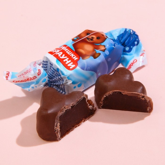 Состав: патока, сахар, глазурь кондитерская (сахар, заменитель масла какао (рафинированные дезодорированные растительные масла (пальмовое)), какао-порошок, соль, эмульгатор – лецитин соевый, ароматизатор), какао-порошок, молоко сухое обезжиренное, агент влагоудерживающий– Е422, агент желирующий – пектин, продукты яичные, краситель Е150d, мальтодекстрин, соль, ароматизаторы.