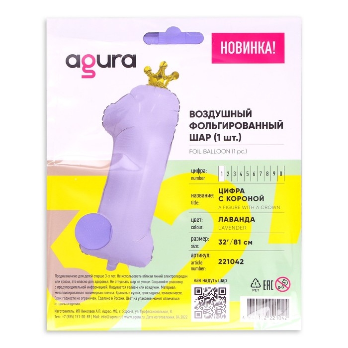 Шар фольгированный 32" «Цифра 1», с короной, мистик лаванда