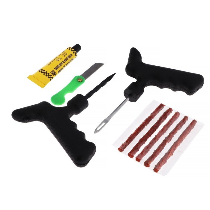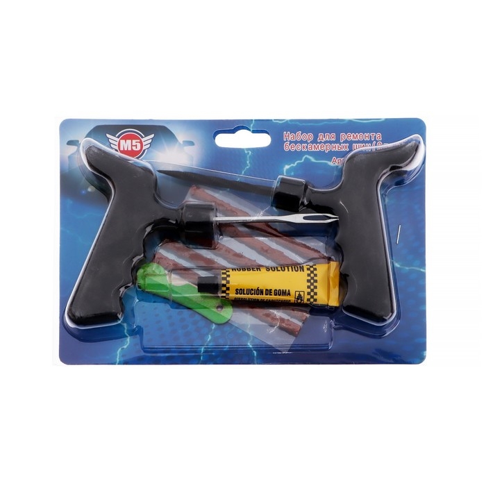 Комплект для ремонта шин 9 предметов М5. Данный набор предназначен для ремонта бескамерной шины как в дорожных условиях, так и на станциях техобслуживания. Жгуты из сырой резины обеспечивают надежную герметизацию поврежденного участка.