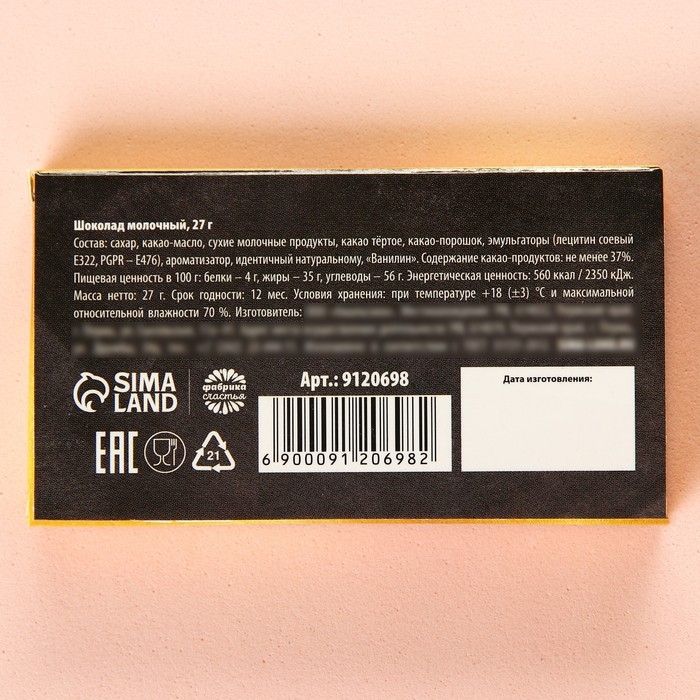 Состав: сахар, какао-масло, сухие молочные продукты, какао тёртое, какао-порошок, эмульгаторы (лецитин соевый Е322, PGPR – E476), ароматизатор, идентичный натуральному, «Ванилин». Содержание какао-продуктов: не менее 37 %.