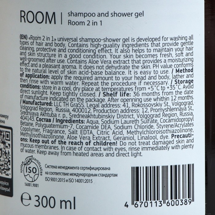 Универсальный шампунь-гель для душа «Room 2 в 1» предназначен для мытья всех типов волос и тела. Содержит высококачественные компоненты, позволяющие бережно и мягко очищать волосы и тело, поддерживает в нормальном состоянии структуру волос и кожи, обеспечивает защитный, увлажняющий и кондиционирующий эффект.
