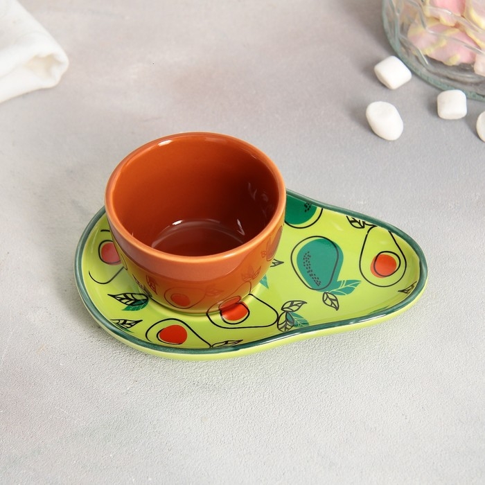 Чайная пара керамическая Persea, кружка 100 мл, блюдце 14х10 см, цвет зелёный-коричневый
