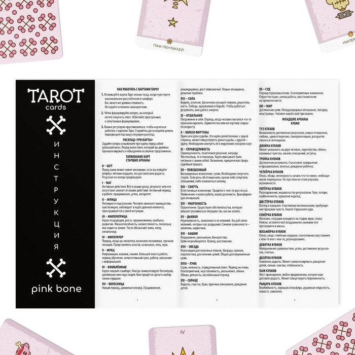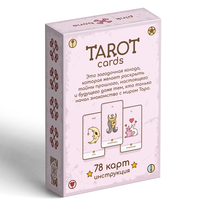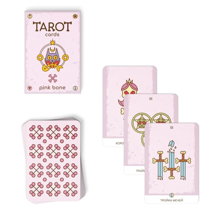 Таро PINK BONE (розовая кость) — это неоднозначная и загадочная колода, которая желает раскрыть тайны прошлого, настоящего и будущего даже тем, кто только начал знакомство с миром Таро.
