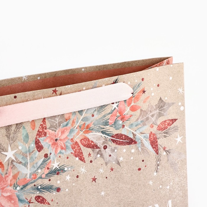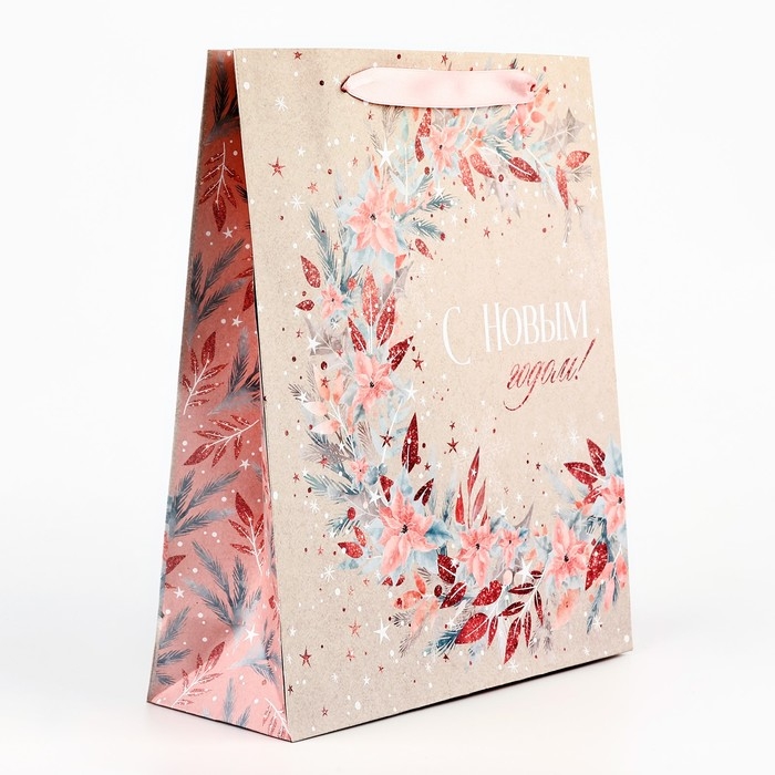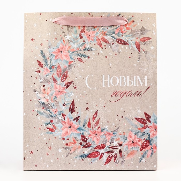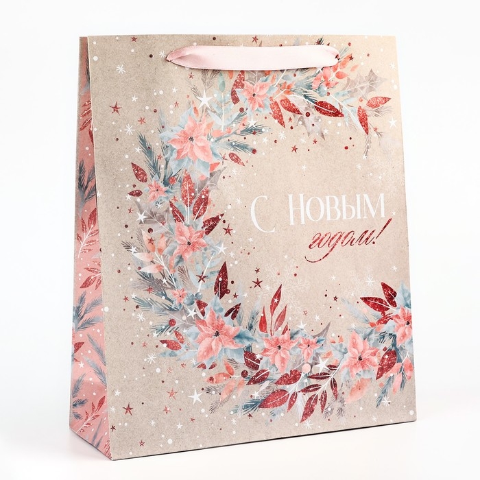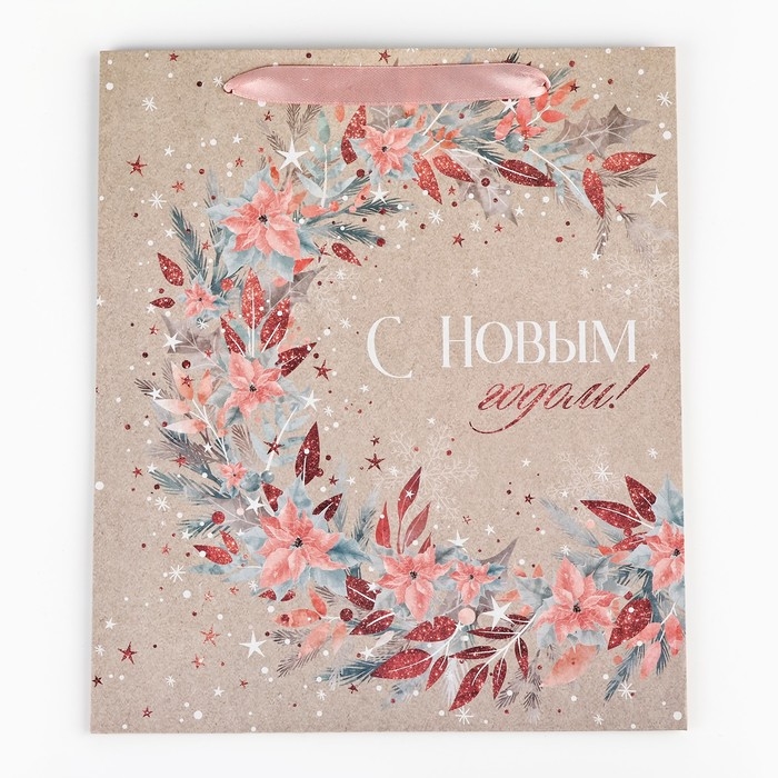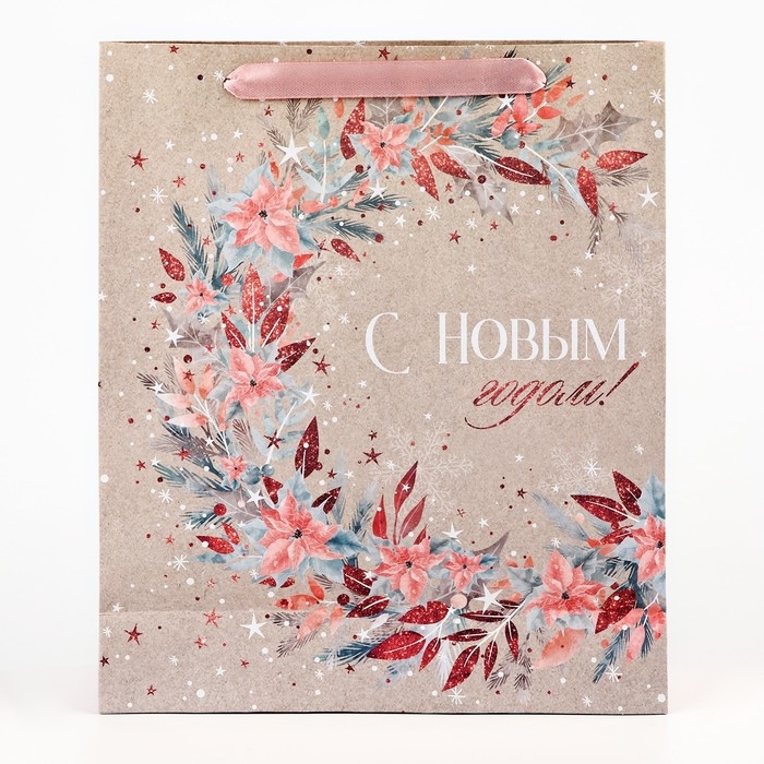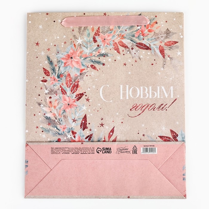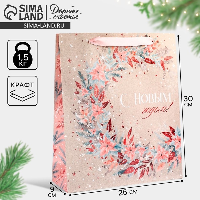 Пакет подарочный новогодний крафтовый вертикальный «Счастье», M 26 х 30 х 9 см, Новый год