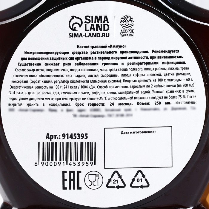 Состав: сахар-песок, вода питьевая, плоды шиповника, чага, трава хвоща полевого, плоды рябины, пижма, трава тысячелистника обыкновенного, лист бадана, листья смородины, плоды софоры японской, цветки ромашки, консервант (сорбат калия), регулятор кислотности (лимонная кислота).