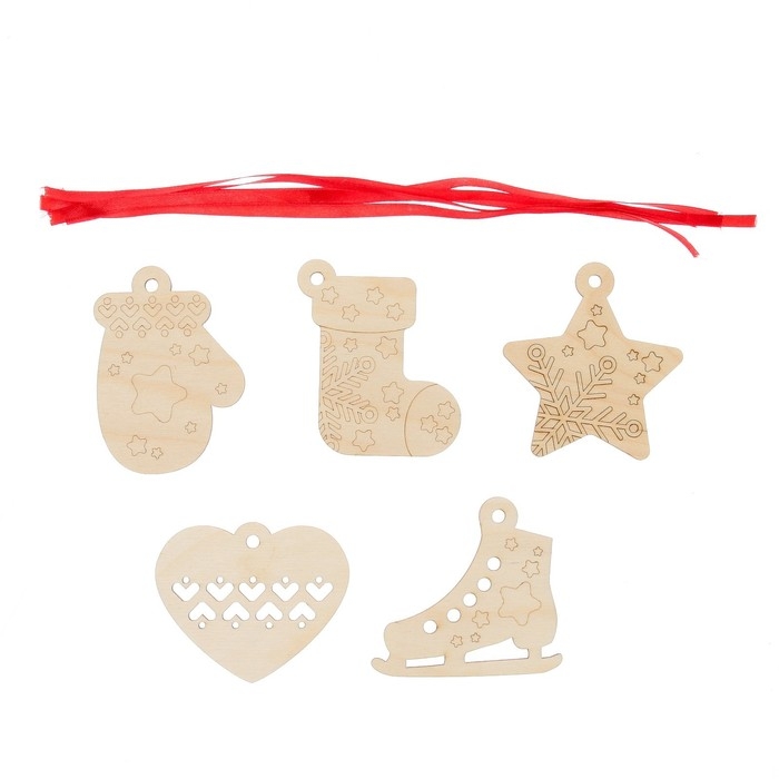 - В наборе 5 деревянных фигурок и ленты для подвесов.