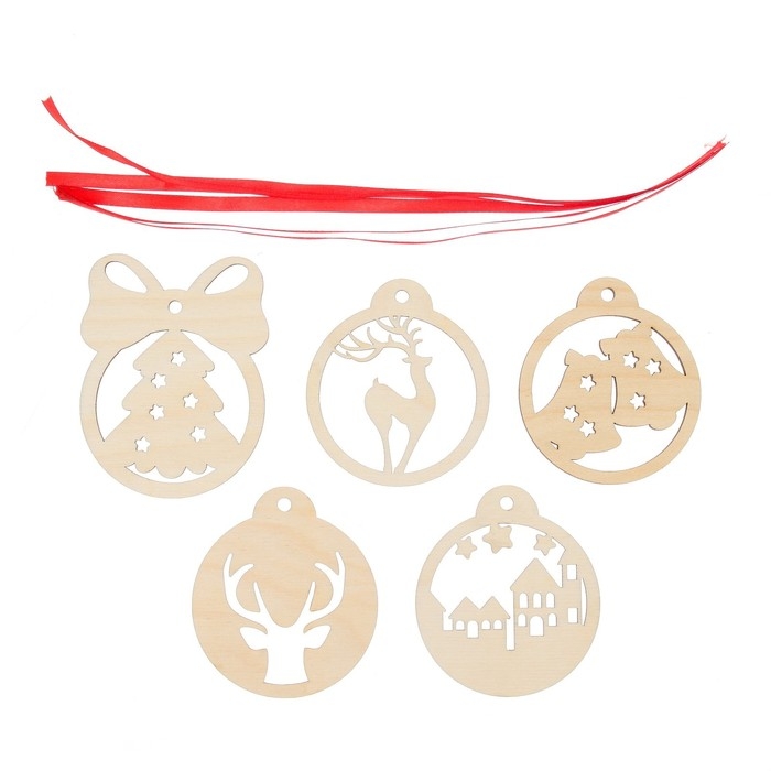- В наборе 5 деревянных фигурок и ленты для подвесов.