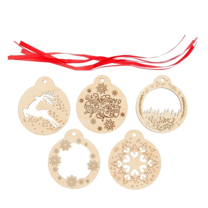 - В наборе 5 деревянных фигурок и ленты для подвесов.