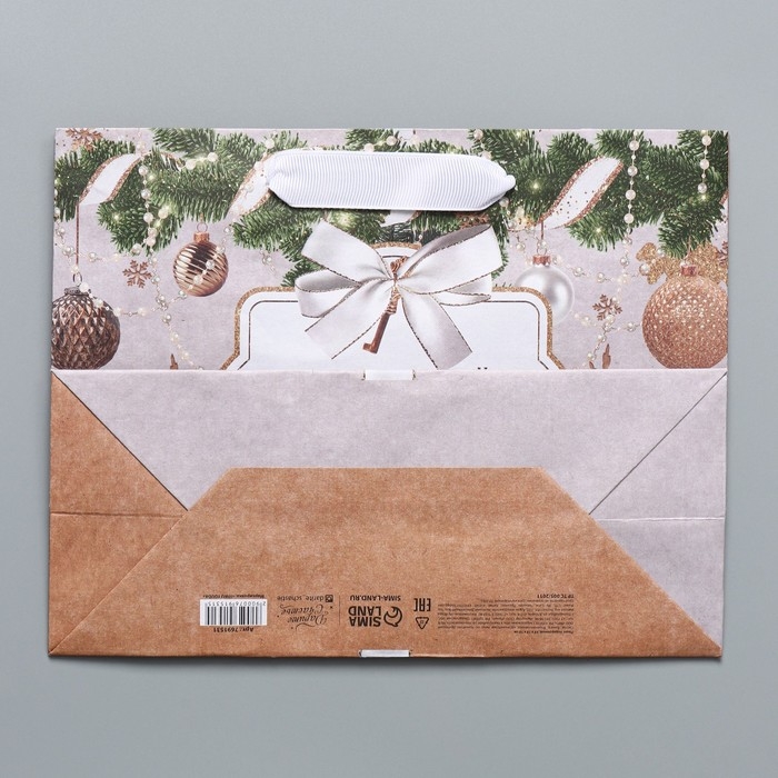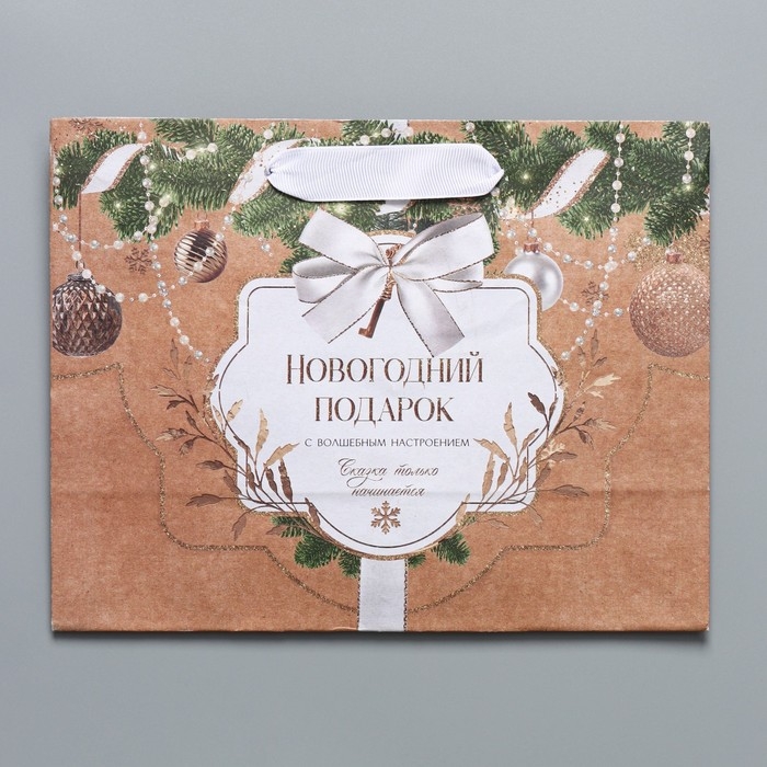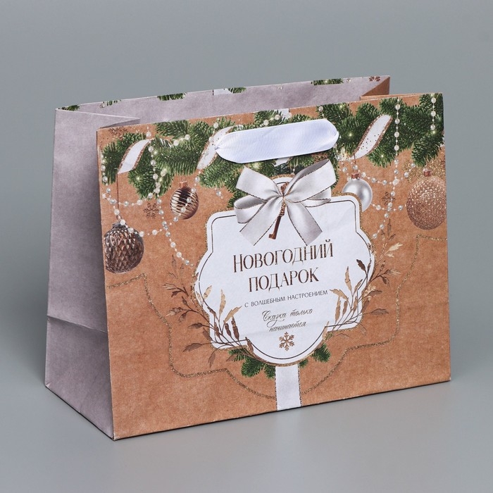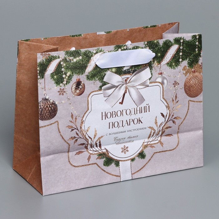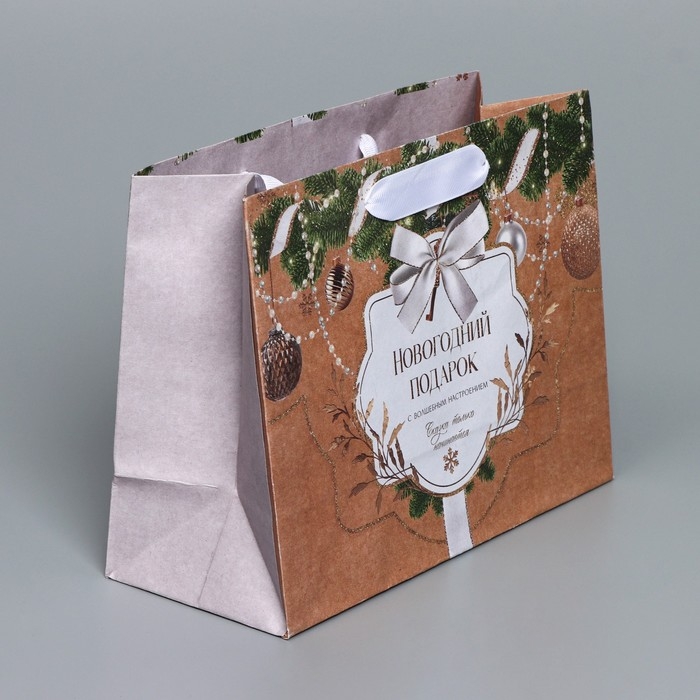 Пакет подарочный новогодний крафтовый горизонтальный «Новогодние игрушки», MS 23 х 18 х 10 см, Новый год
