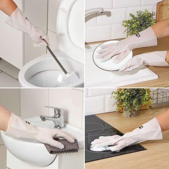 Перчатки с щёточками позволят навести порядок дома без использования дополнительных хозяйственных принадлежностей. Перчатки из ПВХ отличаются плотной структурой и надёжно защитят руки от воздействия химических составов и прочих вредных веществ.