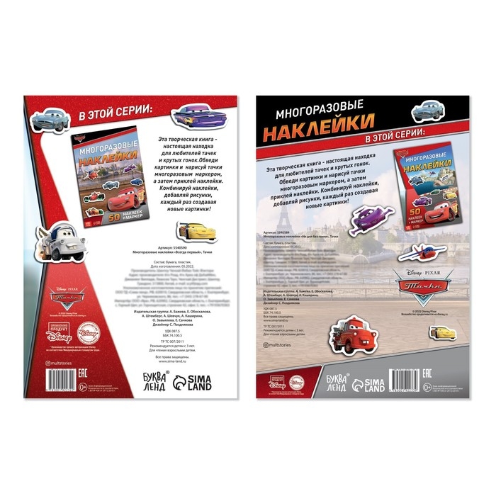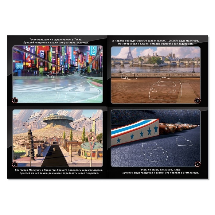 Набор наклеек «Тачки» — это возможность для ребёнка принять участие в невероятных гонках. С помощью многоразовых наклеек можно украсить любой уголок внутри книги и помочь любимым тачкам выиграть заезд!