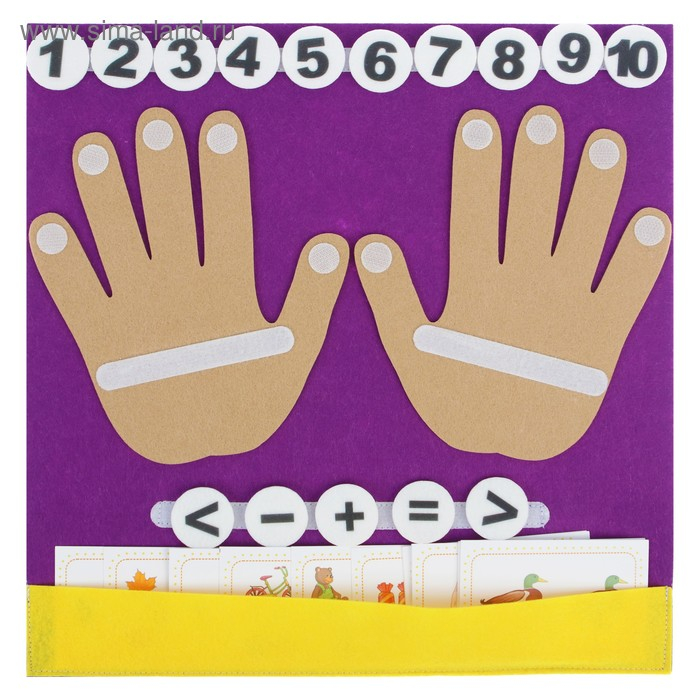 - Составляем задачки. На коврике под ладошками составьте математический пример с помощью цифр и математических знаков («+», «–», «больше», «меньше», «=»). Для игры можно использовать дополнительные карточки (с числовыми примерами). Попросите ребёнка с помощью пальчиков решить задачку.