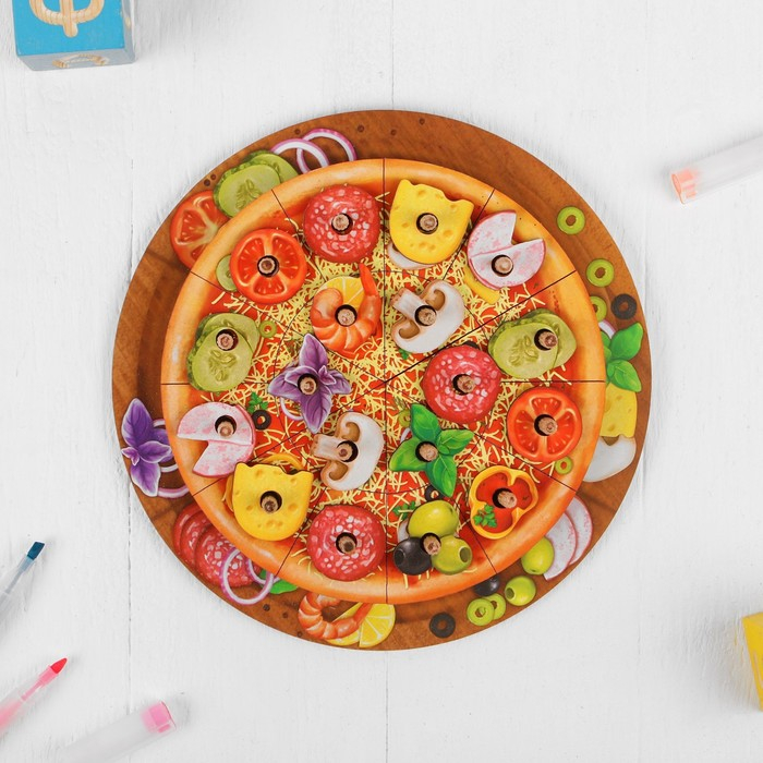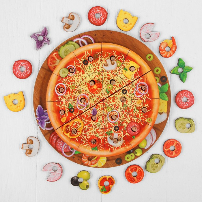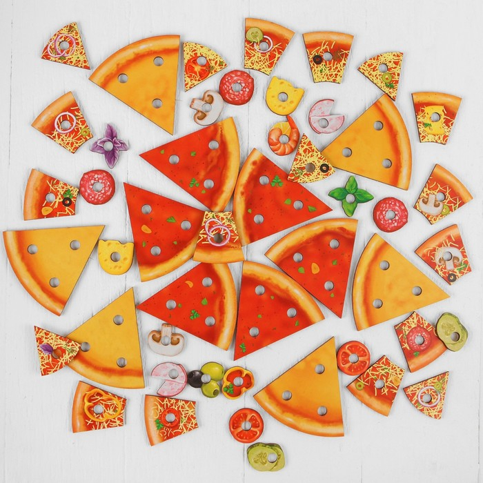 Каждый кусочек третьего слоя пиццы (сыр и начинка) разделён ещё на три части. Чтобы составить цельный кусок, необходимо собрать три детали.