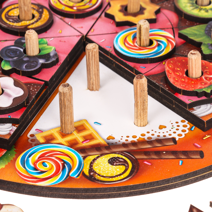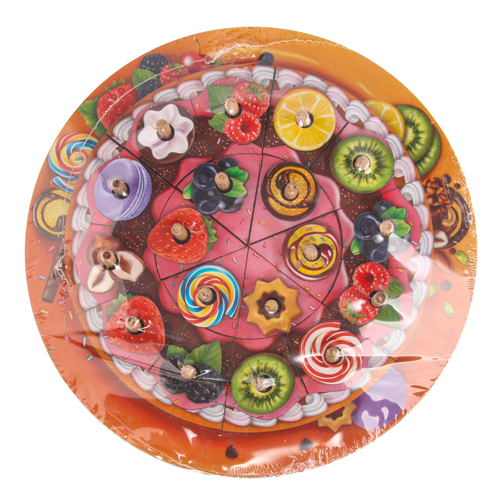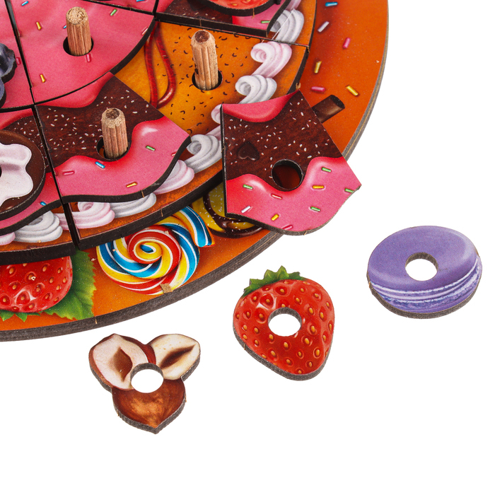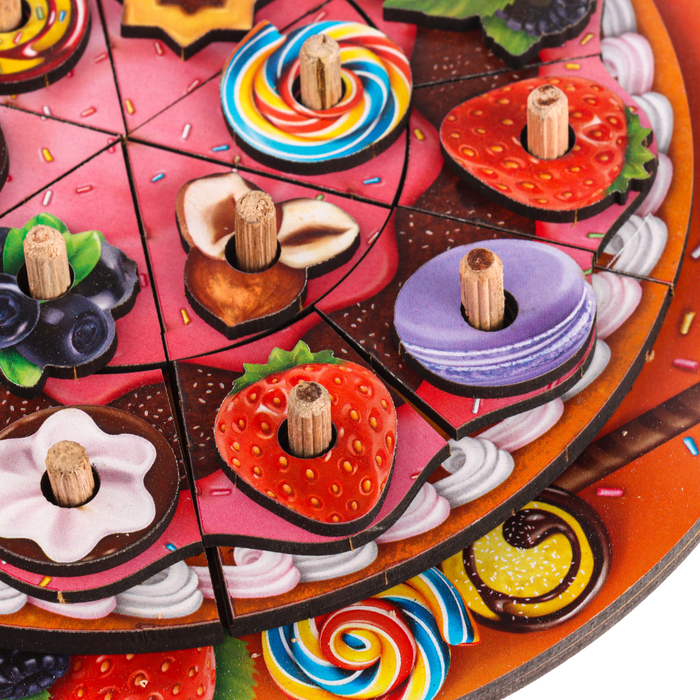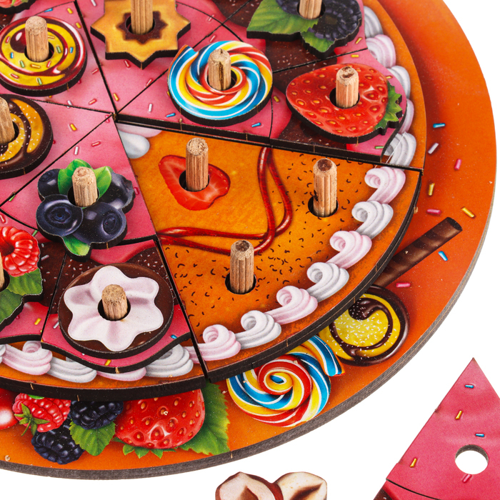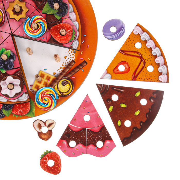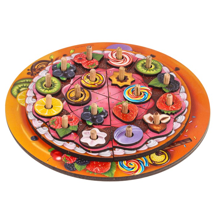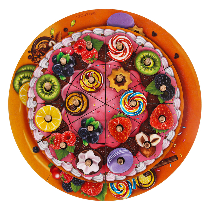 Каждый кусочек третьего слоя торта (помадка и драже) разделён ещё на три части. Чтобы составить цельный кусок, необходимо собрать три детали.
