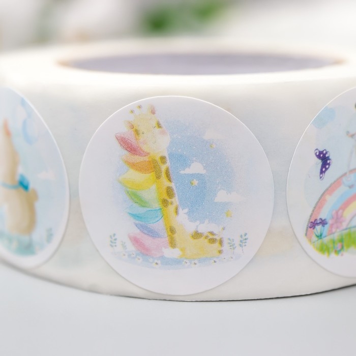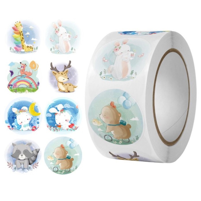 Наклейка бумага "Акварель. Зверушки" d=2,5 см 500 шт в рулоне 3х6,5х6,5 см