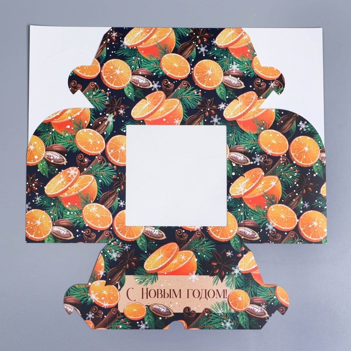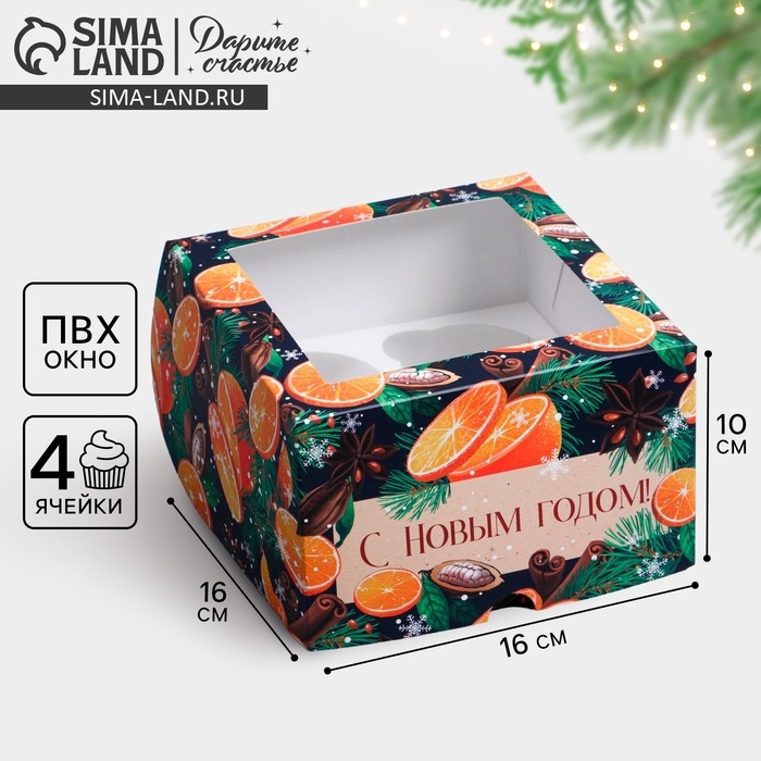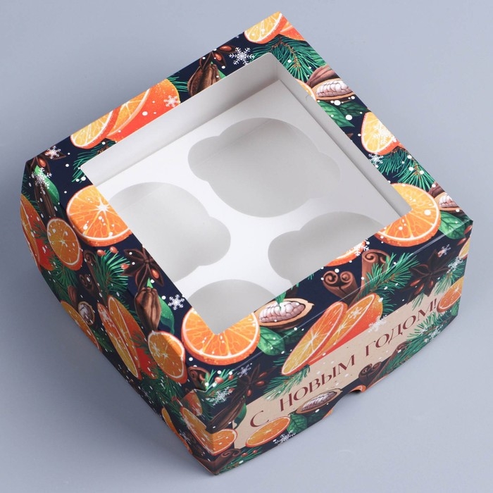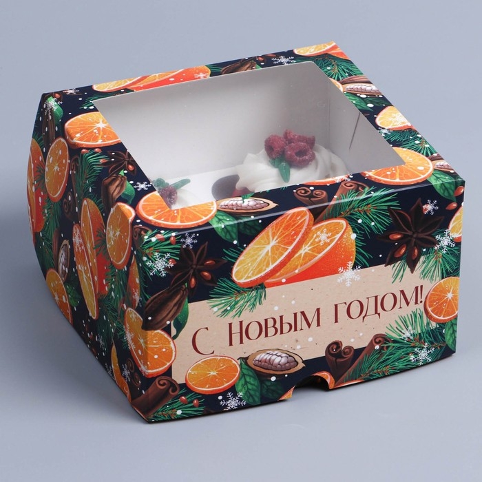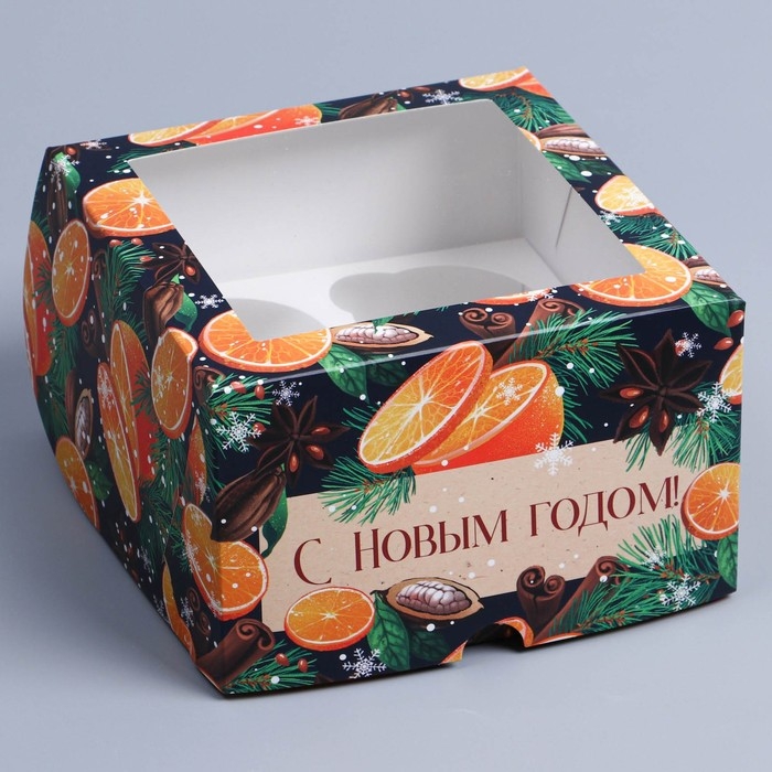 Коробка складная на 4 капкейков с окном «Пряности», 16 х 16 х 10 см, Новый год