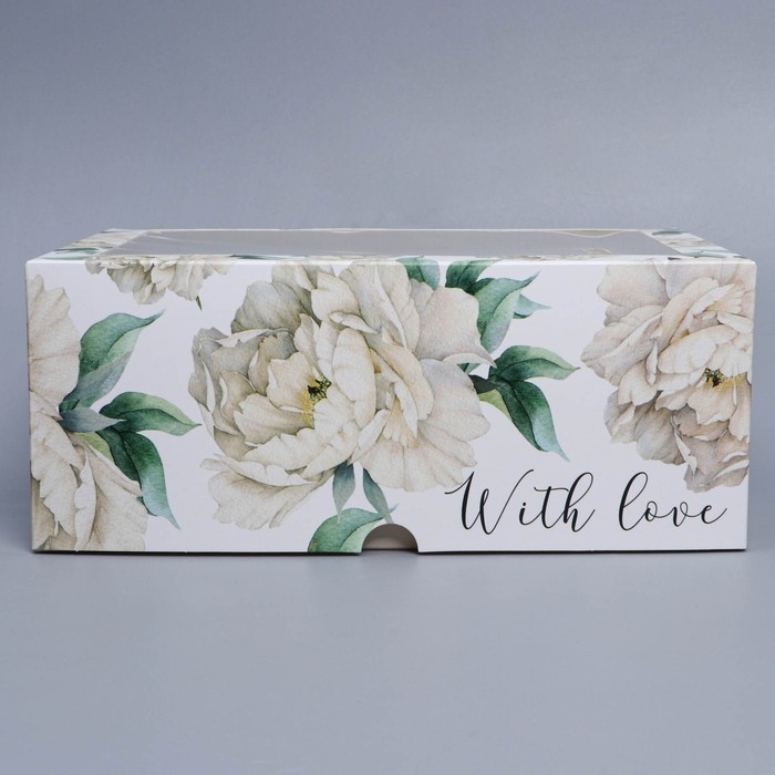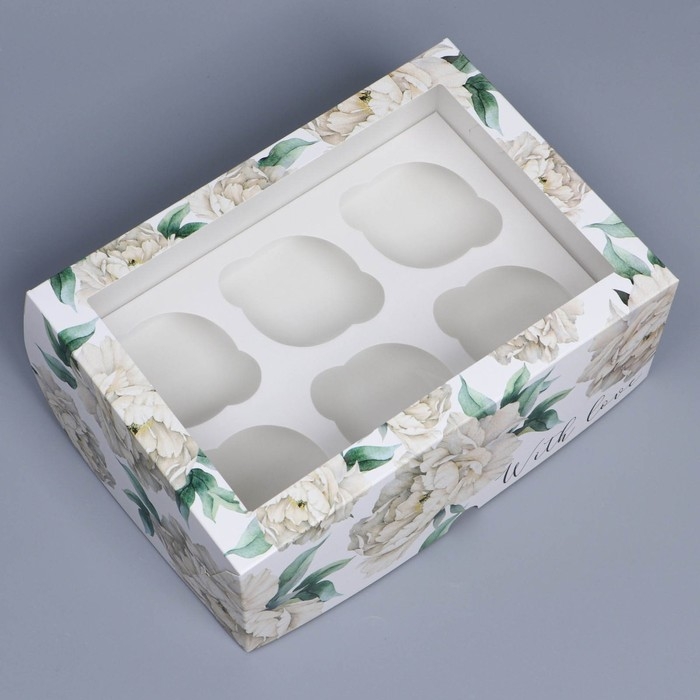 Коробка для капкейков, кондитерская упаковка с окном, 6 ячеек, «Белые пионы», 25 х 17 х 10 см